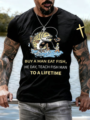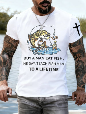 Men's BUY A MAN EAT FISH, HE DAY, TEACH FISH MAN TO A LIFETIME printed T-Shirt