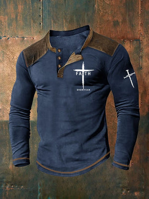 Men's Faith Over Fear Cross Printed Henley Collar Shirt