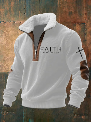 Men's Faith Print Knitted Fabric Zipper Fur Collar Long-Sleeved Sweatshirt