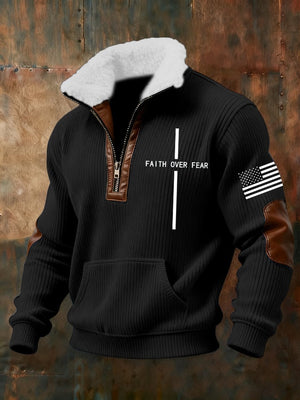 Men's Retro Faith Cross Print Zipper Fur Collar Long Sleeve Sweatshirt