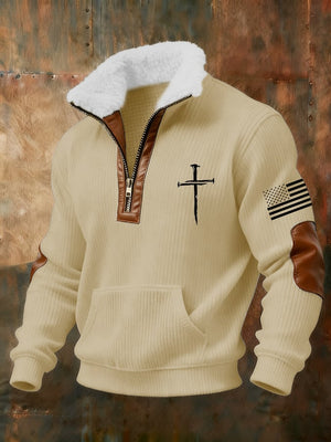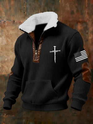 Men's Retro Faith Cross Print Zipper Fur Collar Long Sleeve Sweatshirt
