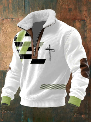 Men's Vintage Faith Design Printed Knit Fabric Zipper Fur Collar Long Sleeve Sweatshirt