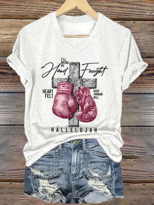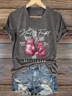 V-Neck Retro Breast Cancer Awareness I'll Bring My Hard Fought Heartfelt Been Through Hell Hallelujah Cross And Boxing Gloves Print T-Shirt