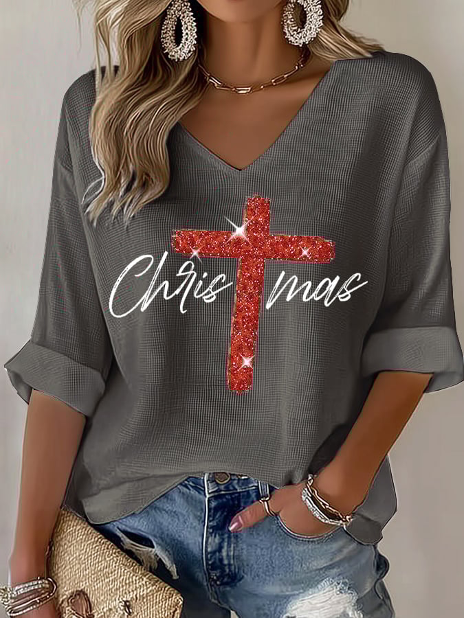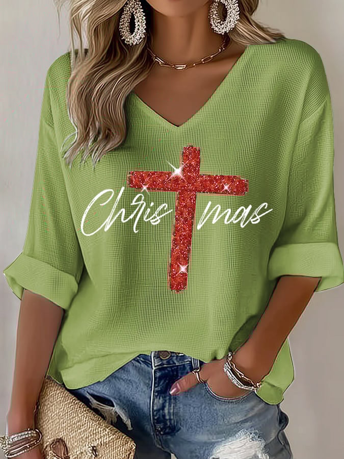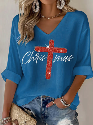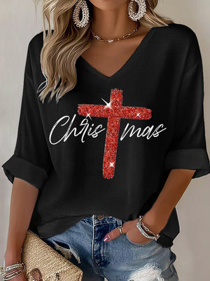 V-Neck Retro Christmas Faith Cross Print T-Shirt