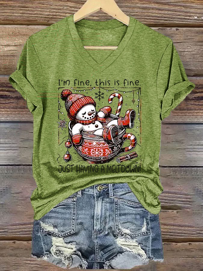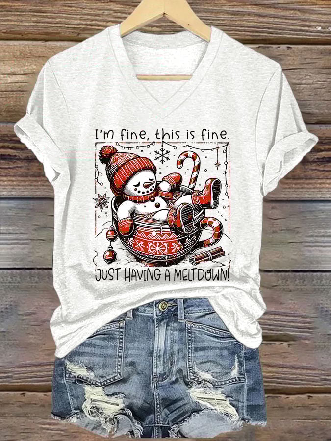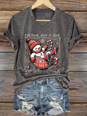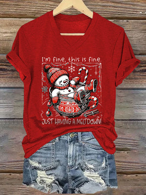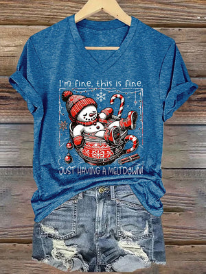 V-Neck Retro Christmas Funny Snowman Hot Cocoa I'm Fine, This Is Fine Just Having A Meltdown Print T-Shirt