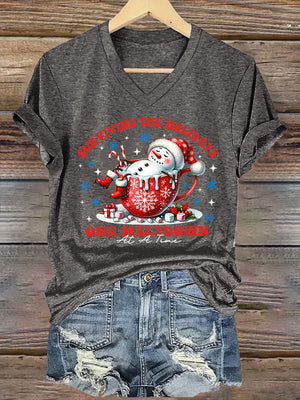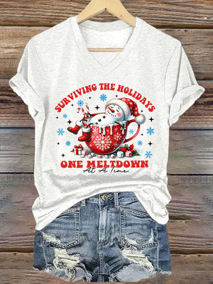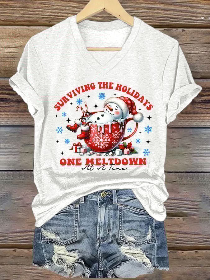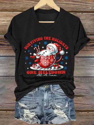 V-Neck Retro Christmas Snowman In Coffee Surviving The Holidays One Meltdown At A Time Print T-Shirt