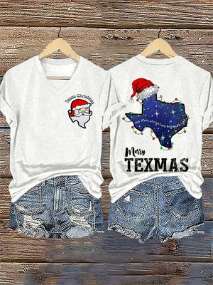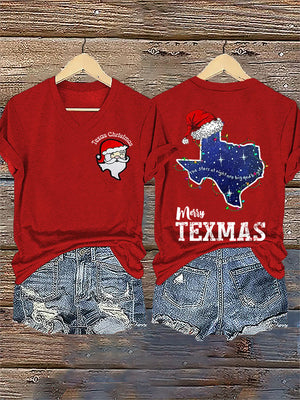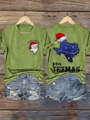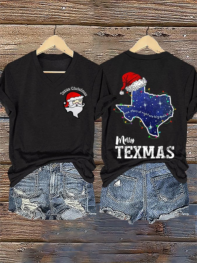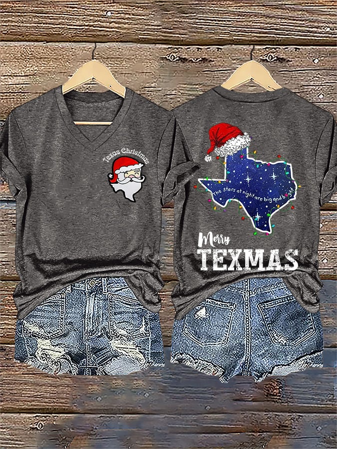 V-Neck Retro Texas Christmas The Stars At Night Are Big And Bright Deep In The Heart Of Texas Print T-Shirt