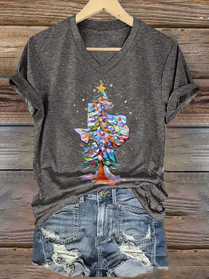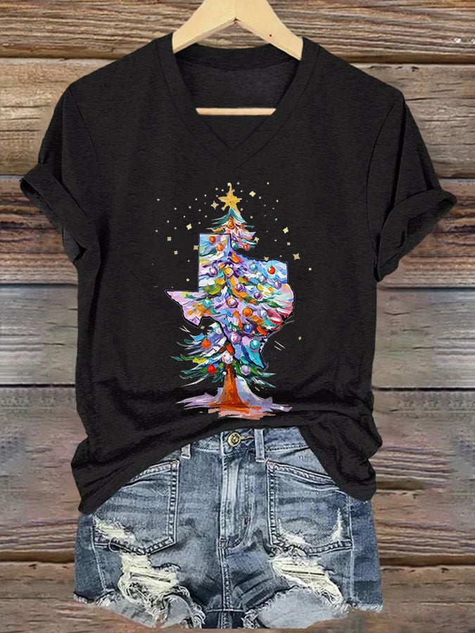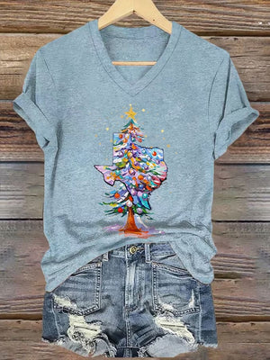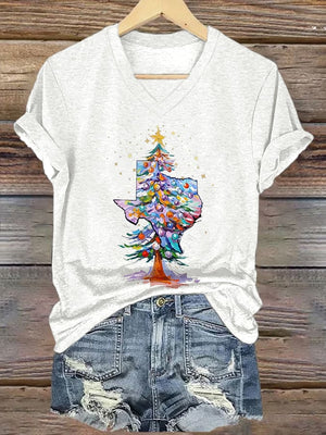 V-Neck Retro Texas Christmas Tree Watercolor Painting Print T-Shirt