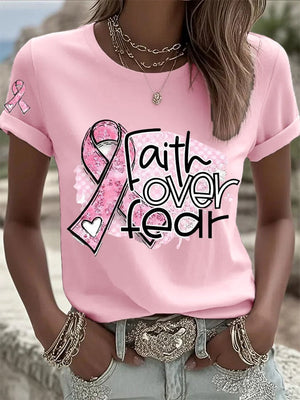 Women's Breast Cancer Faith Cross Faith over fear Print Casual T-shirt