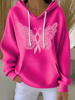 Women's Casual Pink Butterfly Ribbon Textured Hoodie