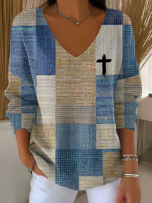 Women's Casual Retro Color Block Faith Ribbed Long-Sleeved Top