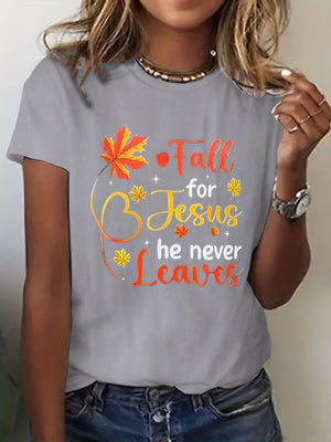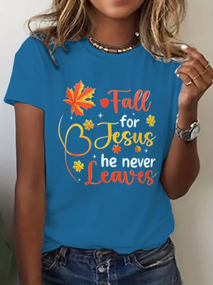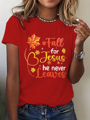 Women's Fall For Jesus He Never Leaves Print T-Shirt