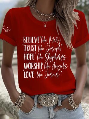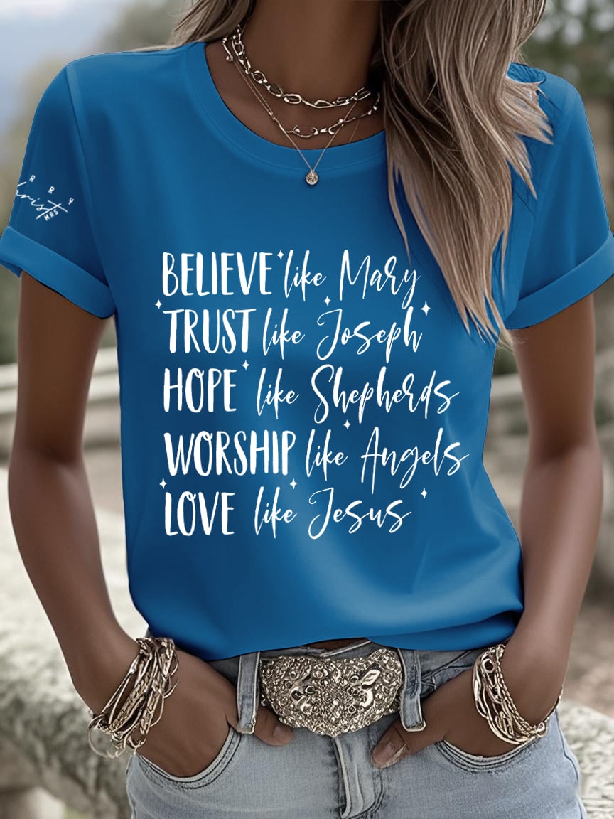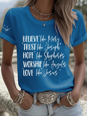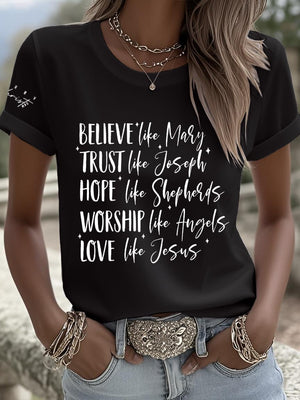 Women's Nativity Believe Trust Life Hope Worship Love Faith Print T-shirt