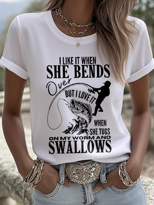 Women's Retro I Like It When She Bends Over But I Love It When She Tugs On My Worm And Swallows Print T-Shirt