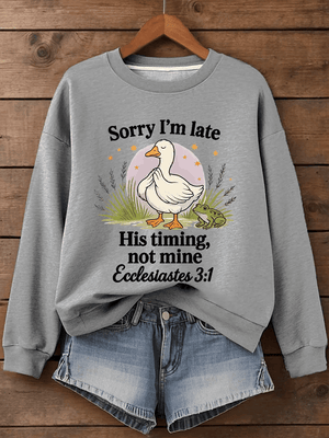 Women's Sorry I'm Late His Timing Not Mine Ecclesiastes 3:1 Funny Silly Goose Print Religious Humor Sweatshirt
