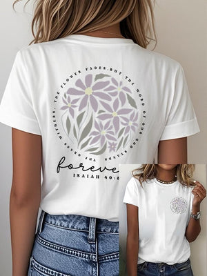 Women's “The Grass Withers, The Flowers Fade, But The Word Of Our God Will Stand Forever, Isaiah 40:8 Bible” Print Casual T-Shirt